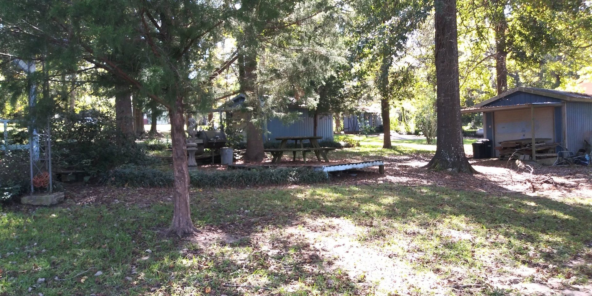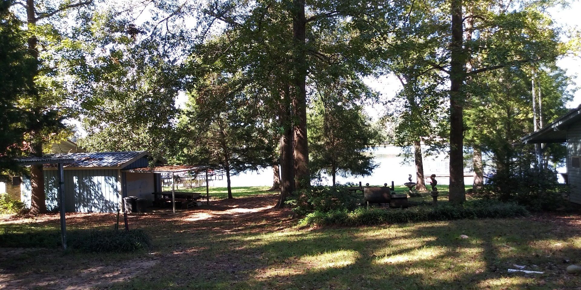 Outdoor picnic bbq area. Landscaped yard. Covered patio overlooking the lake.